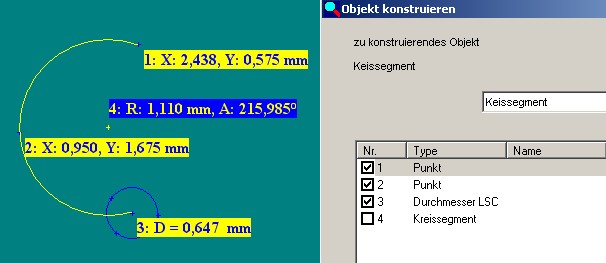 Das Kreissegment wurde aus zwei Punkten und einem Kreismittelpunkt